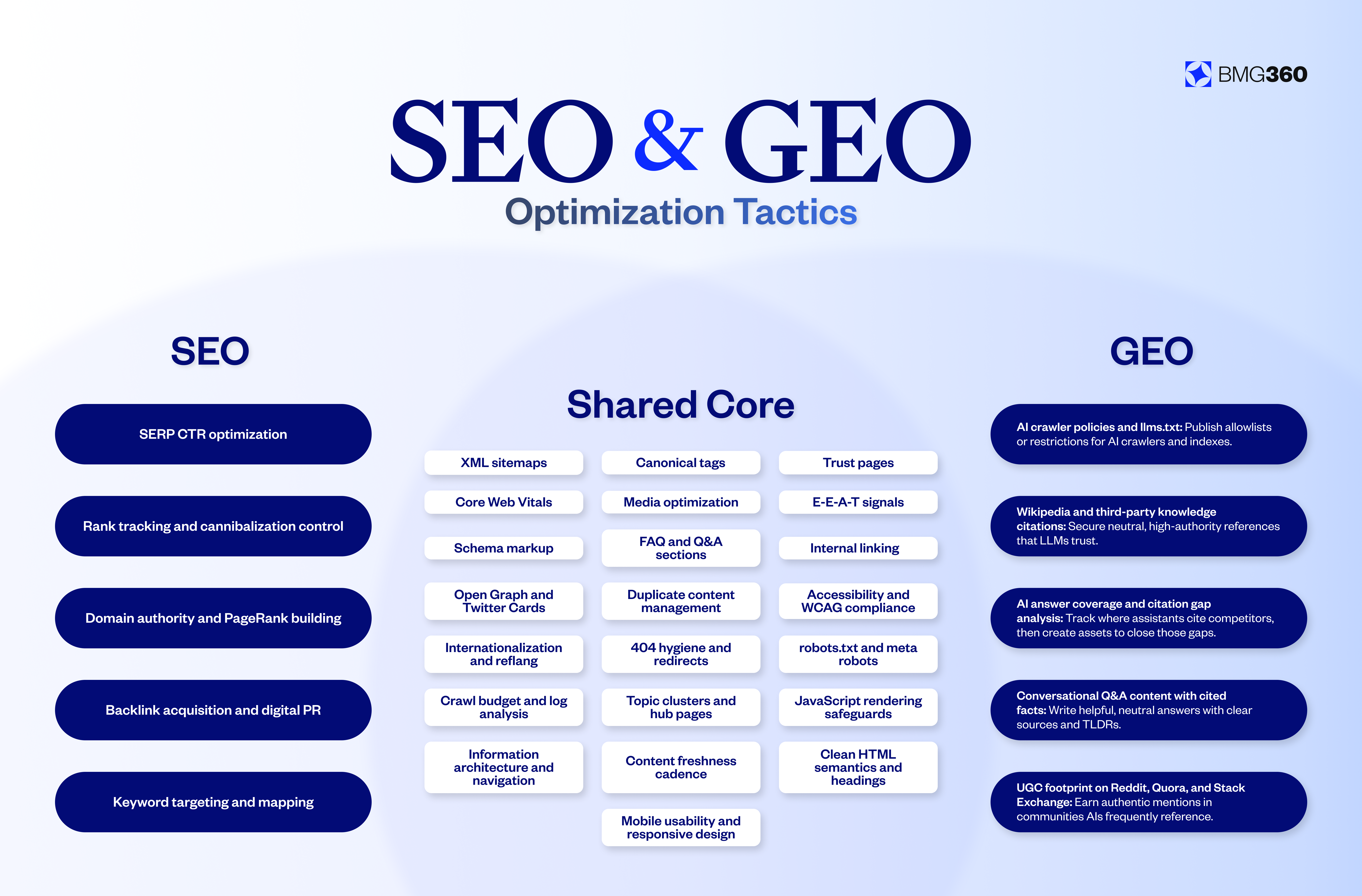 A: As our infographic shows, there’s a large shared core of optimization tactics that serve both SEO and GEO: